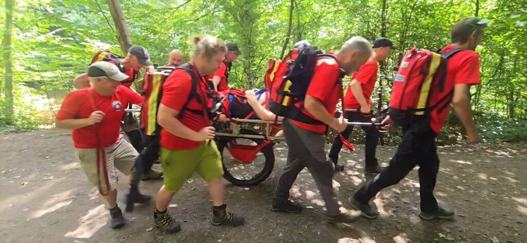 The team were called out by East Midlands Ambulance Service to a casualty in the Torrs area of New Mills. The casualty had been on a family walk along the river side path and slipped down the embankment injuring her ankle. The injury meant she was unable to weight bear and we were tasked with packaging and extracting her back to New Mill Central Station for onwards transport to Hospital with the ambulance crew. The mountain rescue bell stretcher and our wheel were once again utilised to ensure a safe transfer.